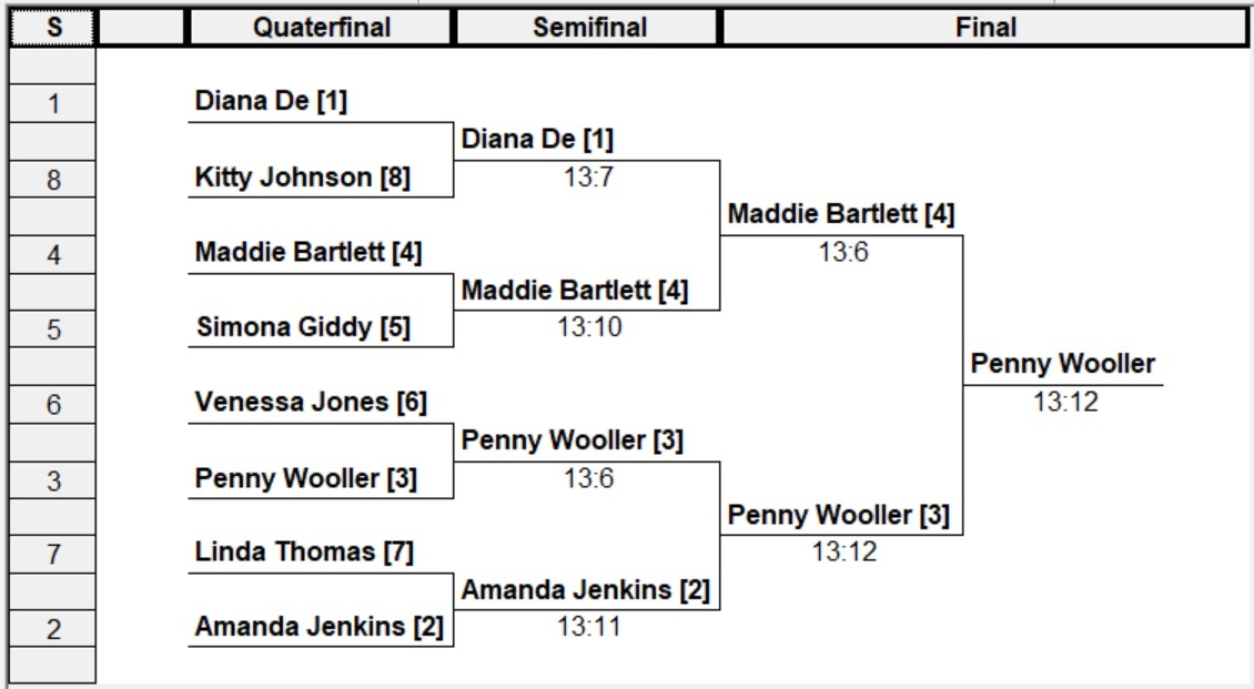 The Quarter Final of the Elimination Stage in the afternoon went very much as might have been expected but the later stages saw a very tight finish between Penny Wooller and Amanda Jenkins with Penny squeezing home for a place in the Final. On the Other side of the draw Maddie Bartlett overcame Diana De for the chance to meet Penny in the Final which was another close run thing with Maddie just coming up short at the end.
