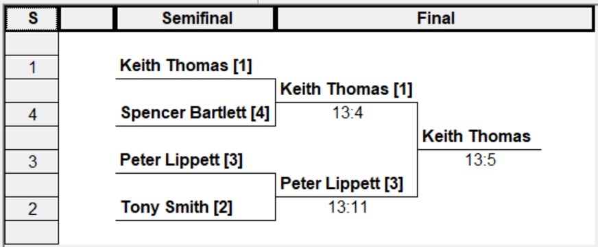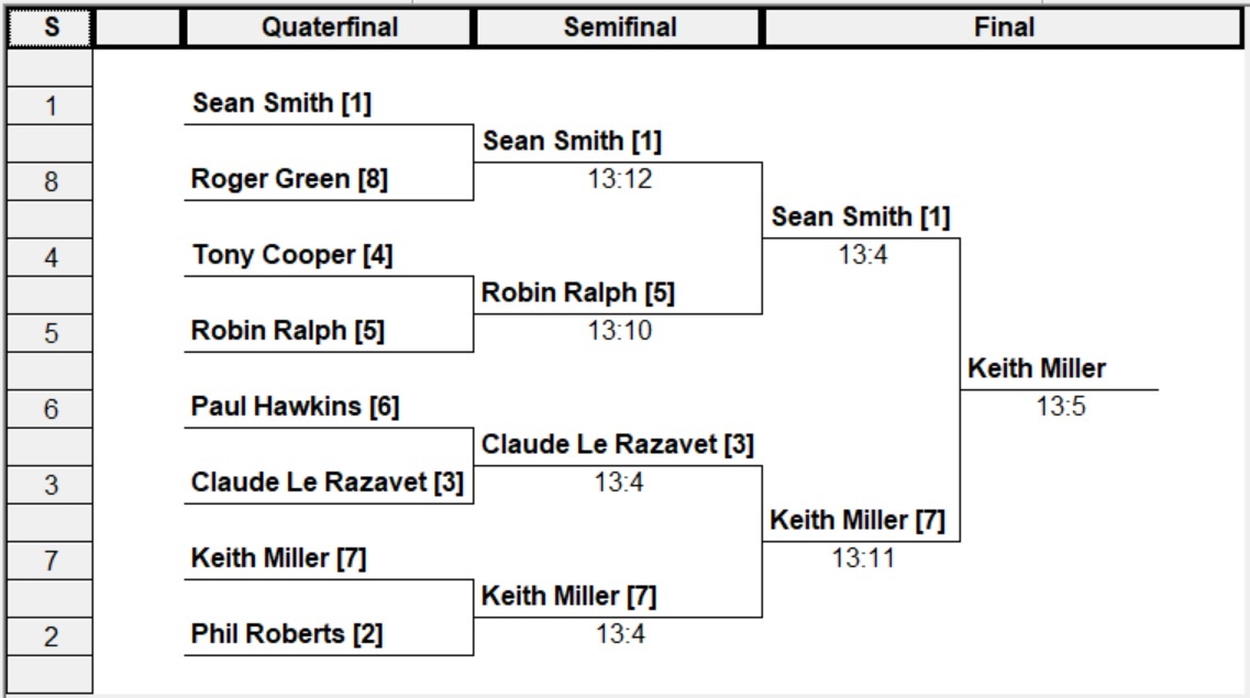 In the Main there were no great surprises but mention should be made of Tony Cooper (4), Paul Hawkins (6) and Keith Miller (7) who are all relative newcomers to the game. Unfortunately they all fell at the first Elimination hurdle except Keith Miller who went on to defeat Phil Roberts (2), Claude Razavet (3) and Sean Smith (1), the tournament favourite.