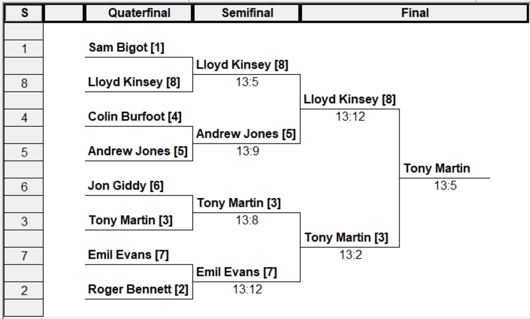 In the Plate, those who were Ranked after the morning session from 9 to 16, Tony Martin, an experienced but infrequent player of the game, came through to beat newcomer Lloyd Kinsey in the Final.
