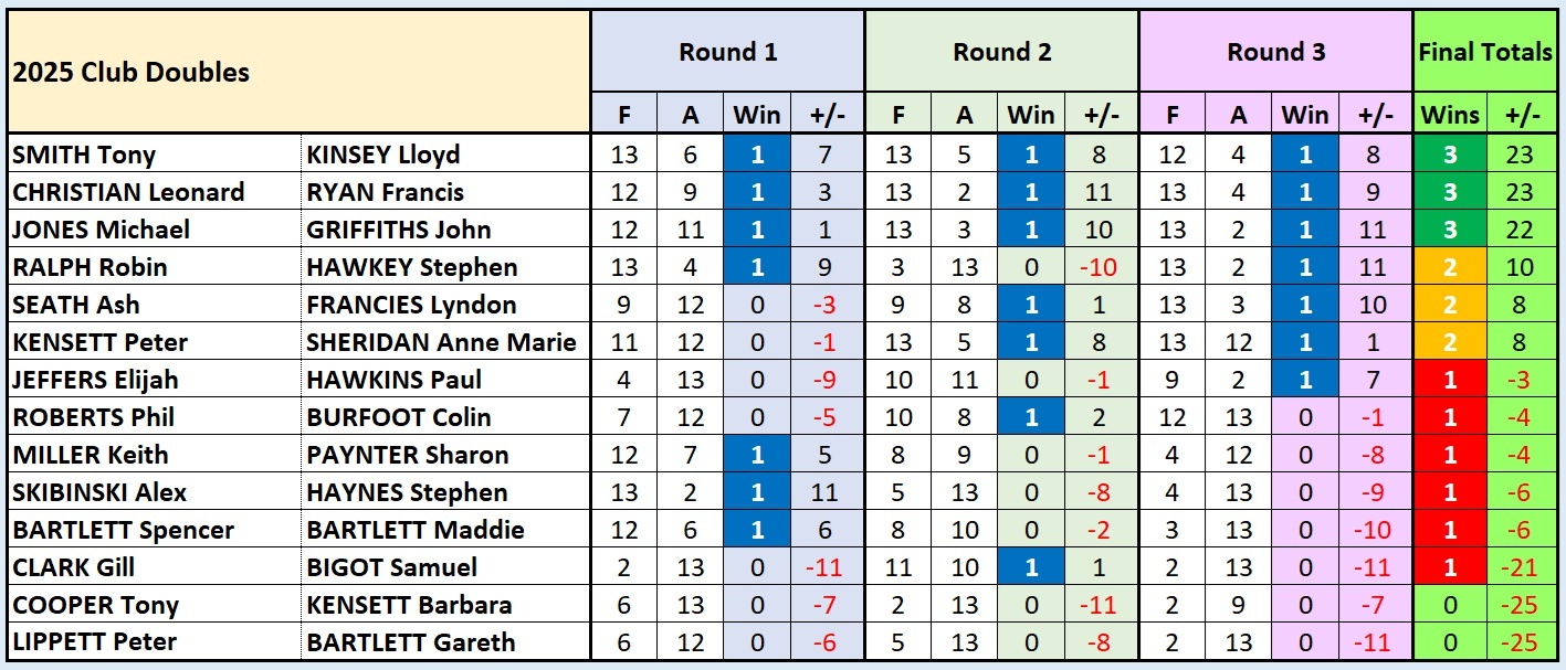 The Annual Club Doubles were held on 26 October 2025 in the usual format of a 3 round melee with partners being selected at random with the help of a little seeding to try to get evenly balanced teams as far as possible. 28 Members entered making up 14 teams