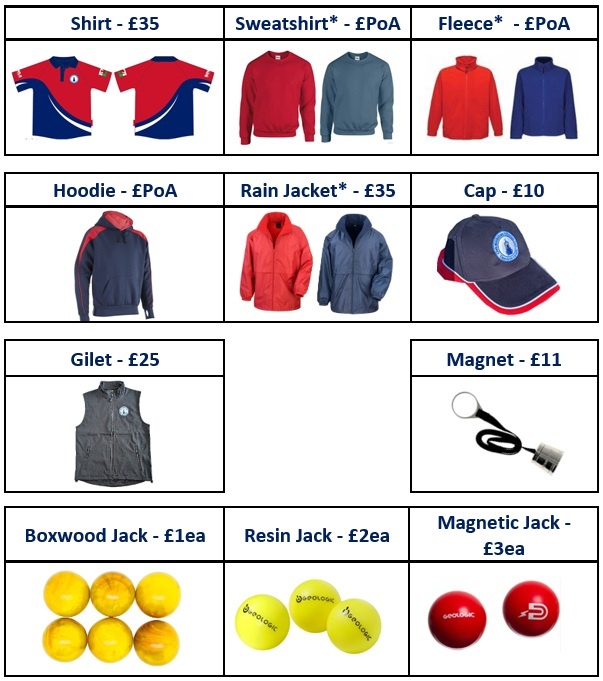All items of clothing can be ordered from Bernard Adshead (Treasurer). Please email him with your requirements using the following email address: treasurer [at] monkstonepetanque [dot] org [dot] uk or speak to him at the club.