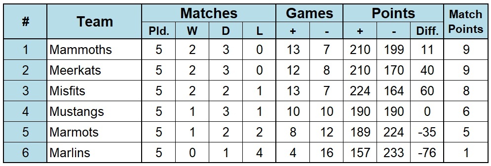 Position determined by Match Points (Win=3, Draw=1), then Games Won, then Points Difference, then Points-for